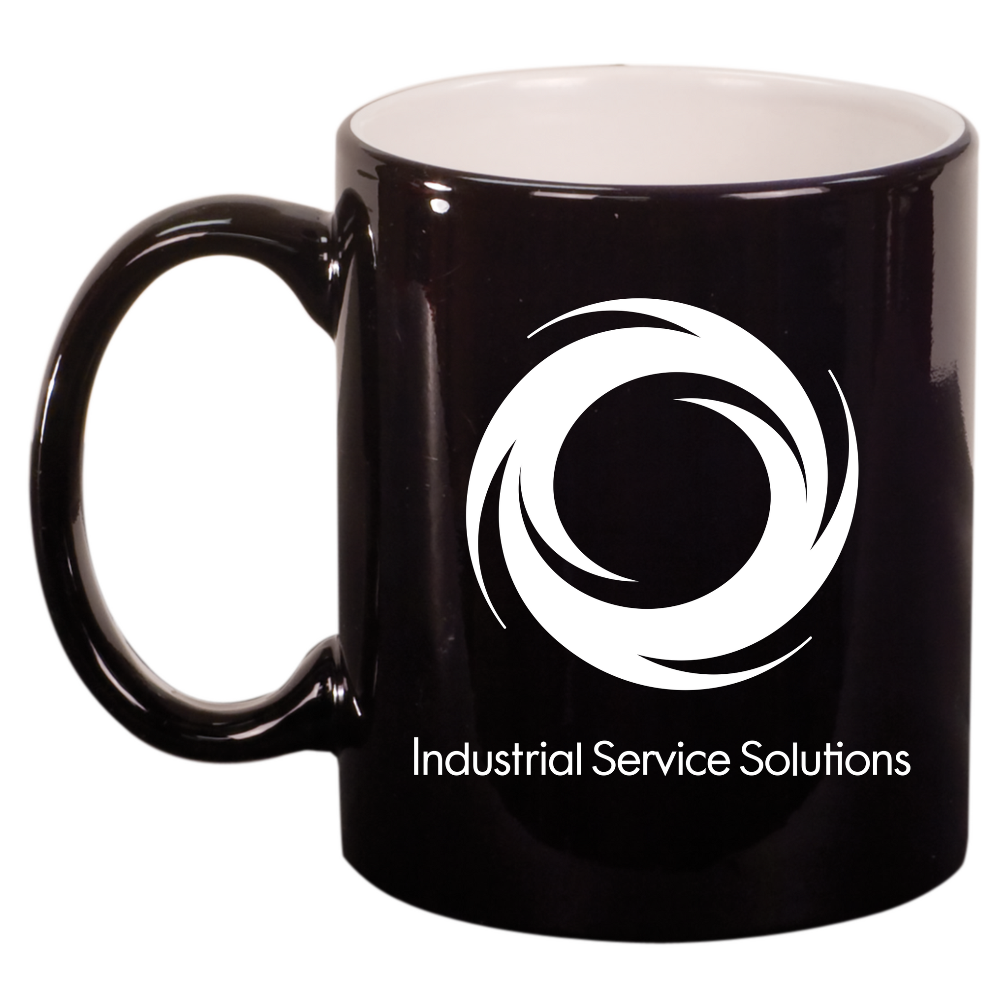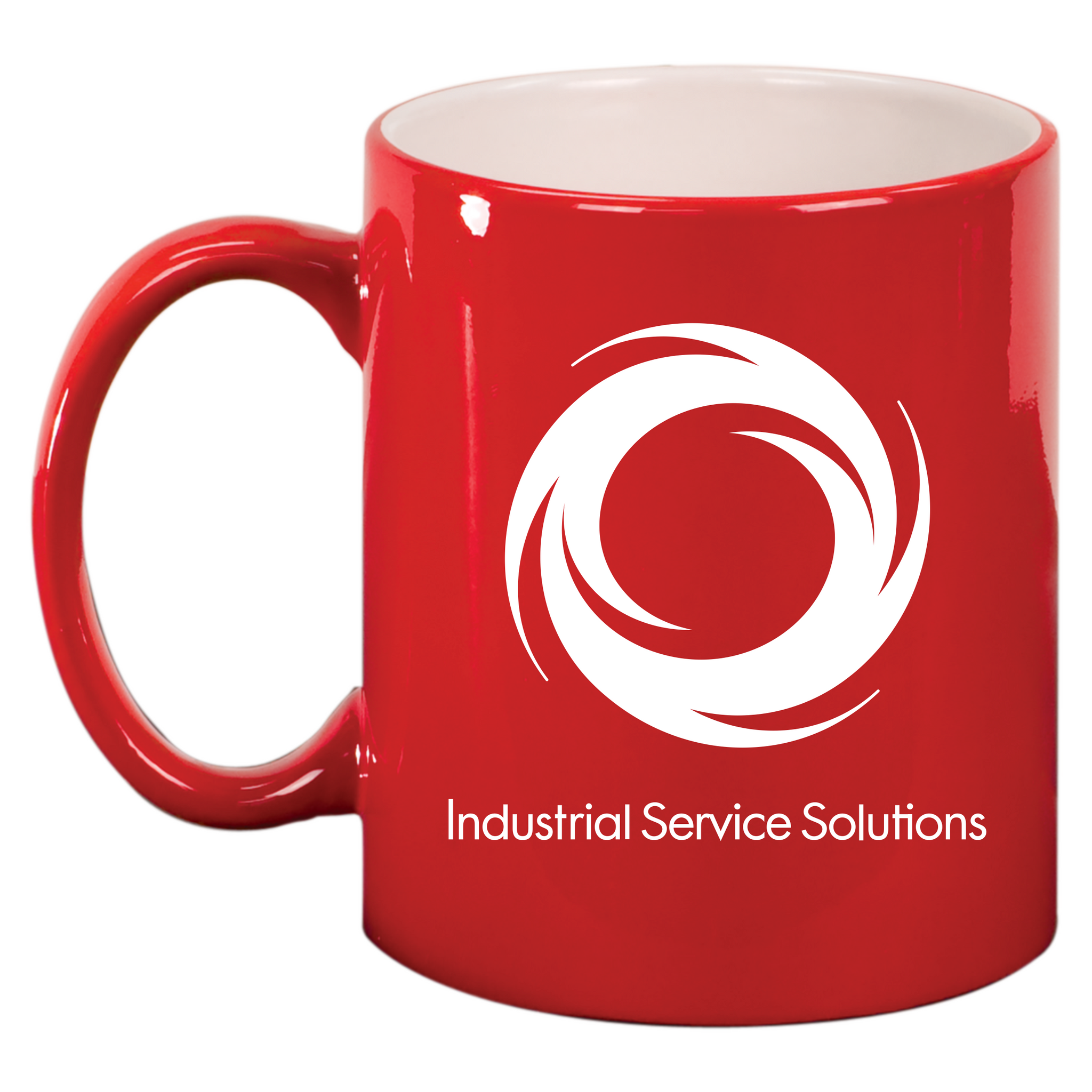 Enjoy your favorite beverage from this 11 oz black or red ceramic mug, custom engraved with the Industrial Service Solutions logo. This microwave safe mug can be personalized for a great promotional item or gift.
